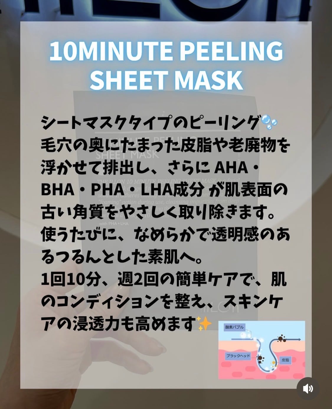 吸湿性・通気性に優れた化粧シートが肌に透明にフィットし、酸素の泡を発生させるピーリングシートマスク。 うるおいを与え、荒れた肌表面をなめらかにするLHA、PHAピーリング成分配合。 ガリクトミセス発酵液配合