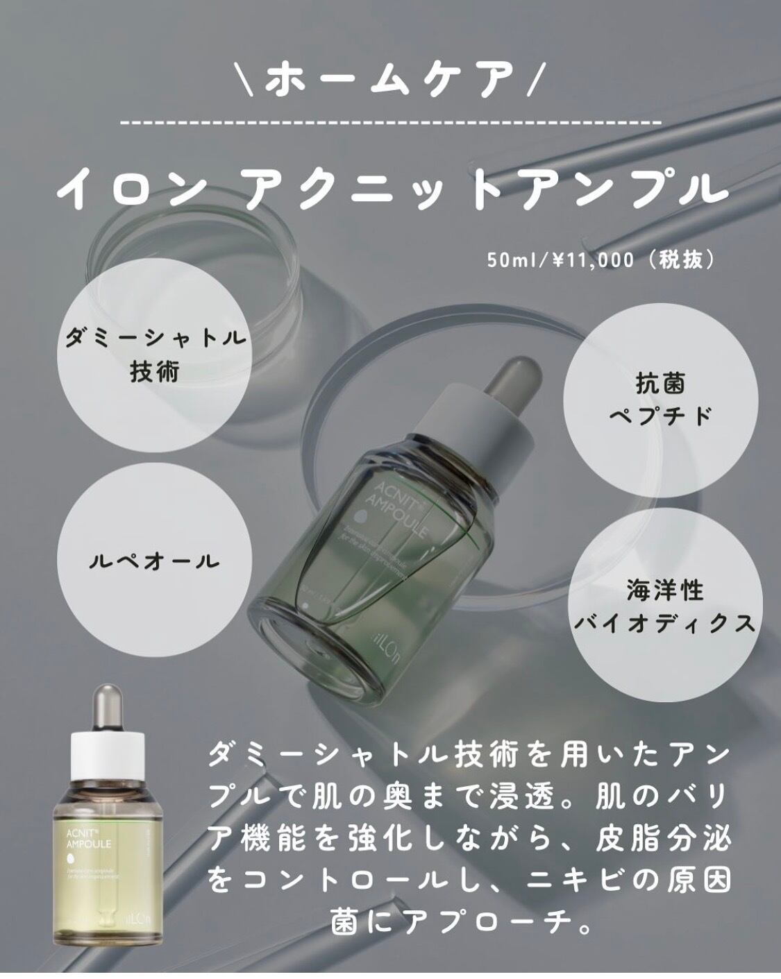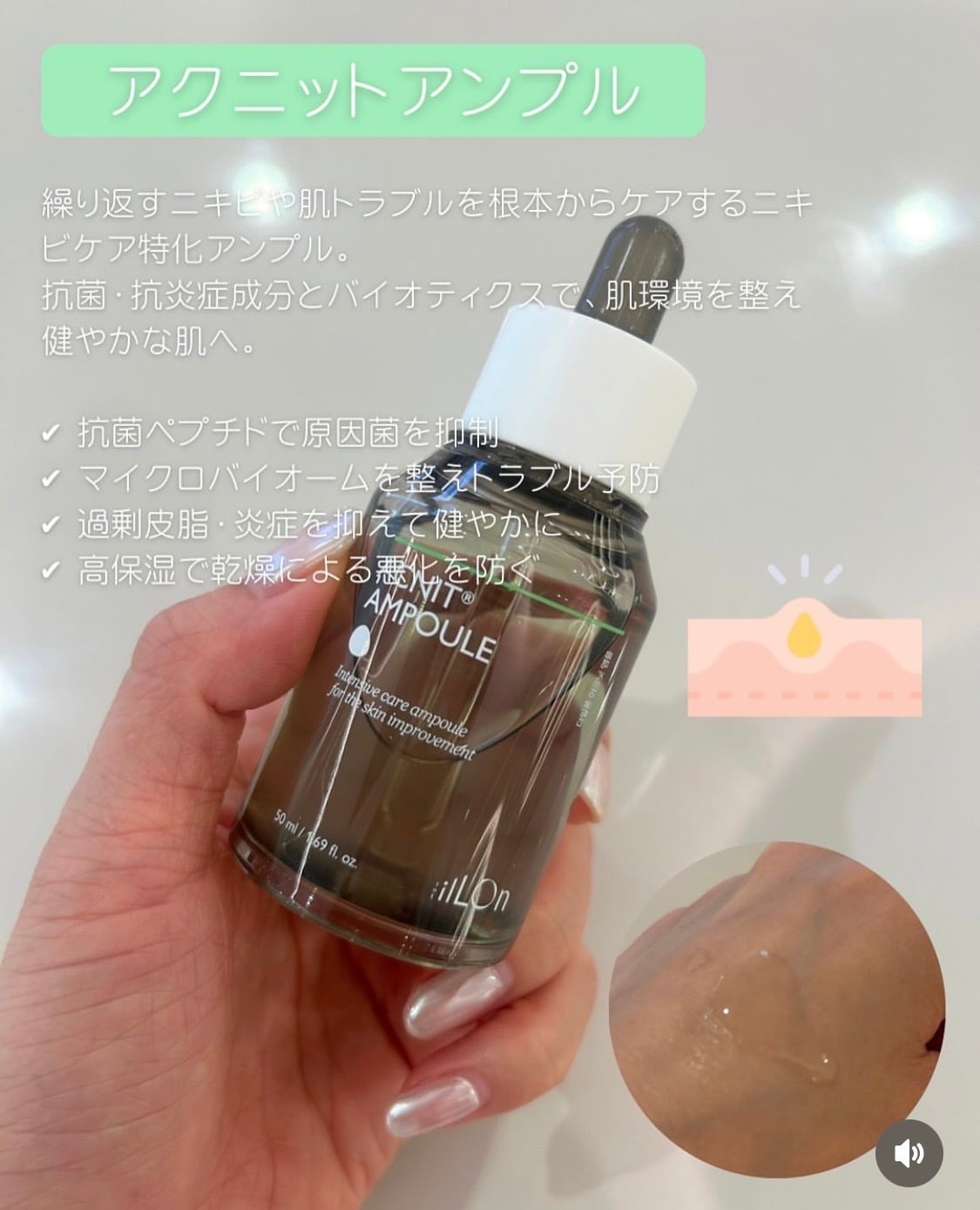 ACNIT AMPOULEは、ニキビや肌トラブルを根本からケアし、肌本来のバリア機能を高めるスキンケアアイテム。抗菌ペプチドや海洋バイオティクスの働きで、繰り返すニキビを予防しながら、肌の健康をサポートします。毎日のスキンケアに取り入れることで、ニキビ知らずのなめらかな肌へ。